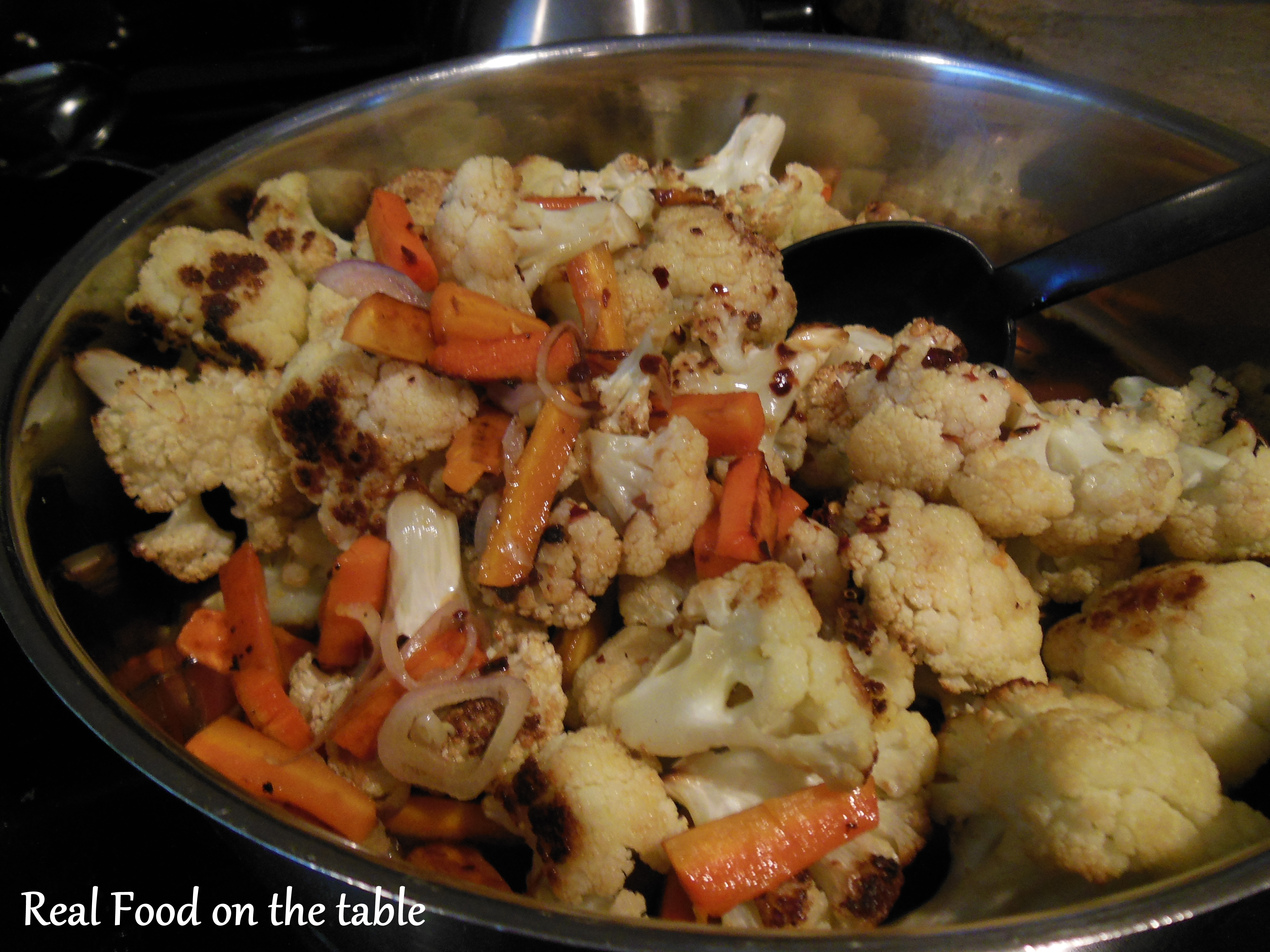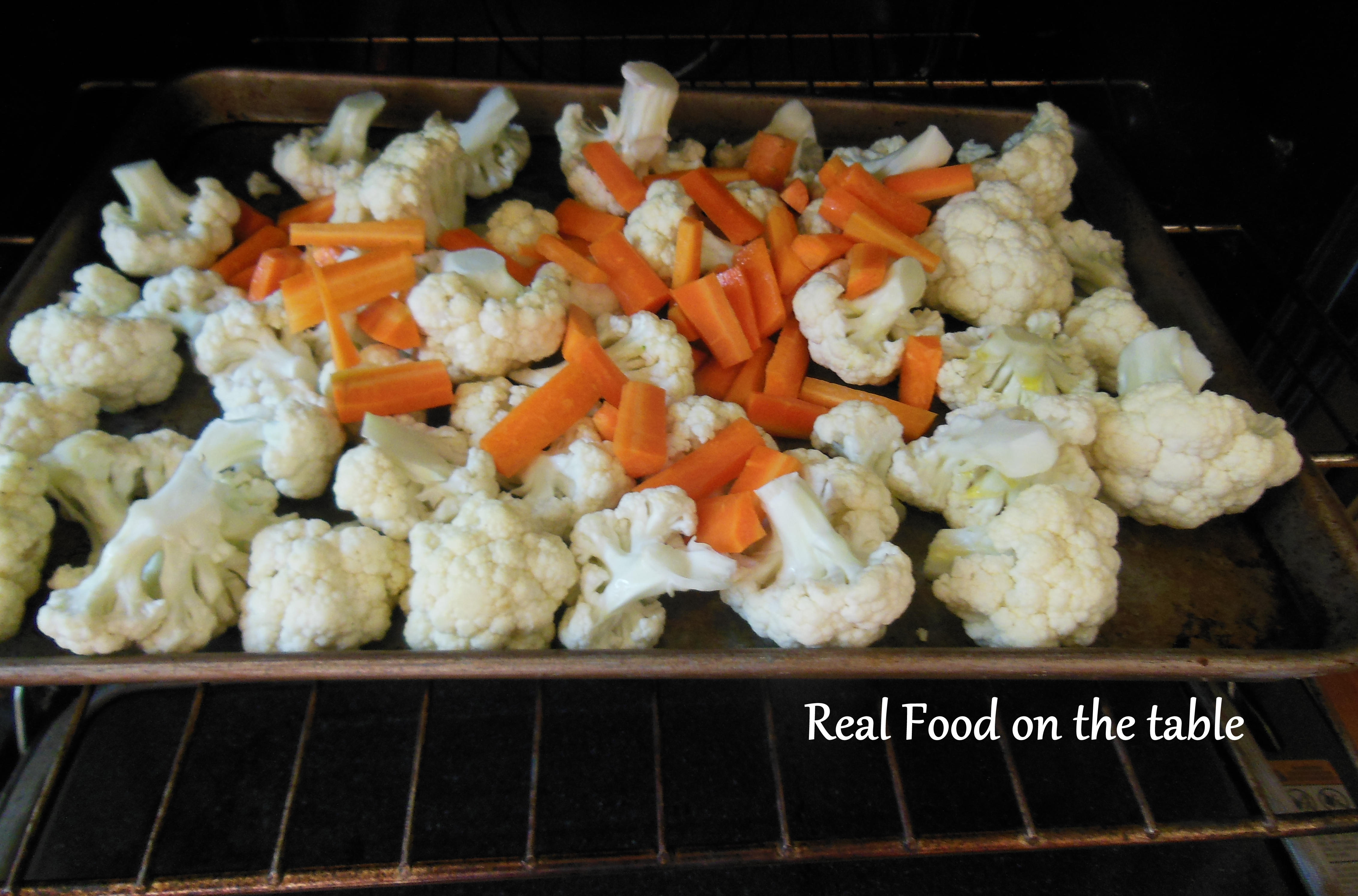 I started by tossing the cauliflower florets and some thin carrot sticks with some olive oil and roasting at 425 degrees for about 25 minutes.