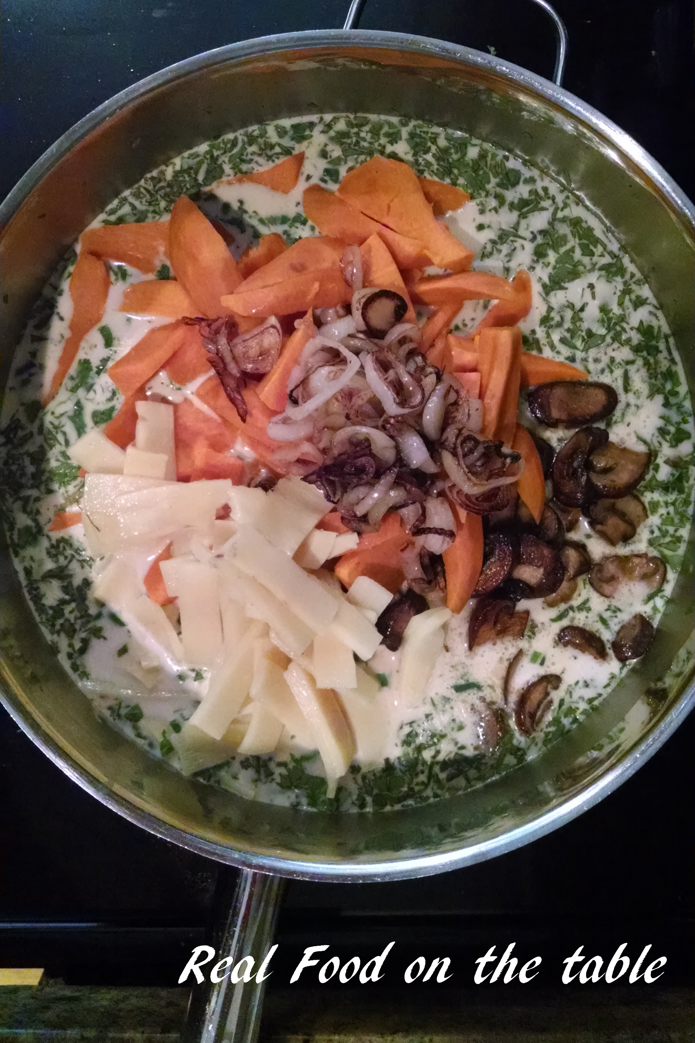 Spread the carrots into a casserole dish that is oven-safe. Then pour about a cup of cream over. (I just said it was mainly veggies, I never claimed it was low fat!) Sprinkle with salt and pepper.