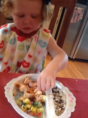 I serve this salmon over a bed of rice and black beans. While the kiddos were entertaining themselves at another moment in the afternoon, I opened, drained, and  rinsed my black beans, cooked my rice and mixed the two together.  This I could also just set aside until dinner time.