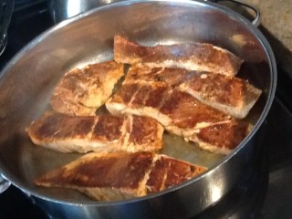 I then heated a bit of oil in the skillet and added the salmon.  I cooked it for about 5 minutes on each side until the spice rub made a nice crust.  At this point you can pull the salmon fillets apart  to assure it is well cooked through, or you can do a sneak test and leave the fillets in tact.  The latter is my preference.  Just remember that salmon can go from succulent to dry in a heart beat, so make sure you don’t overcook.