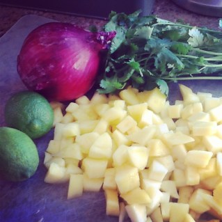 The mango salsa is quick to put together and waits well in the fridge.  That sitting time also always the flavors to meld better.  I threw the salsa together in a 5 minute window I had early afternoon when no one was calling my name.  Simply put, you peel and chop 2 mangoes, (insert confession here – I can’t stand the feel of a mango.  Don’t know what it is, but it’s the only food whose feel creeps me out.  As such, I buy them already peeled and packaged at Costco.  This makes the chopping go super fast), finely dice 1/2 of a red onion, chop a bunch of cilantro, mix together and add one squeeze of lime juice.