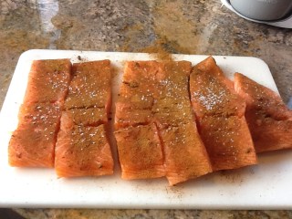 I started by just sprinkling both sides of the halibut with salt and pepper.  Then I generously sprinkled the fish with cayenne pepper and cinnamon.